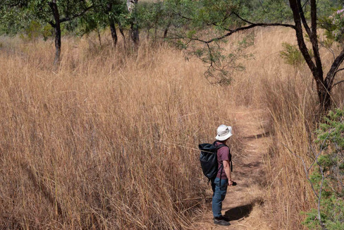 Die Landschaft hier ist klasse, lose Baumbestände aus Bloodwood Eukalyptus, Helikopter Tree's und vielen Boabs neben hohem Gras, Palmen, Yucca-ähnlichen Bäumen und Büschen, dazwischen Sandsteinfelsenplateaus, ein ehemaliges Barriereriff von vor ca. 380 Millionen Jahren aus dem Devon.